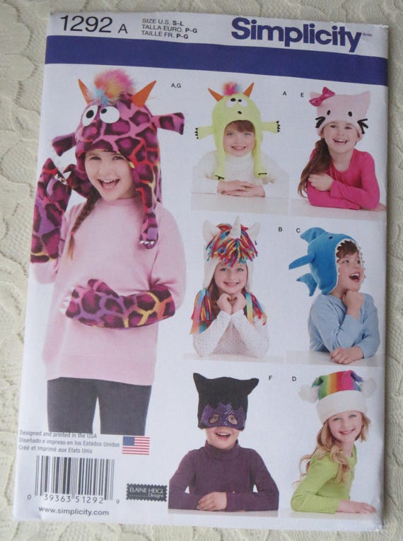 Simplicity 1292 Hat And Mittens Unicorn Shark Kitten Bat Etsy
