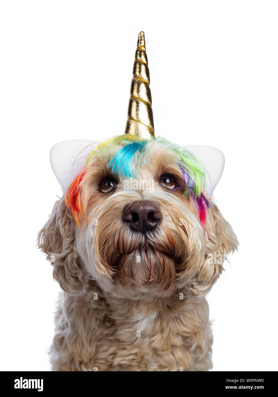 Head Shot Of Sweet Young Adult Female Silky Labradoodle Wearing