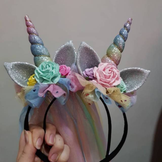 Headband Unicorn Bando Unicorn Silver Tanduk Rainbow Tanpa Veil