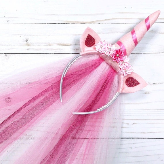 Pink Unicorn Headband W Tulle Veil Unicorn Horn Flower Etsy